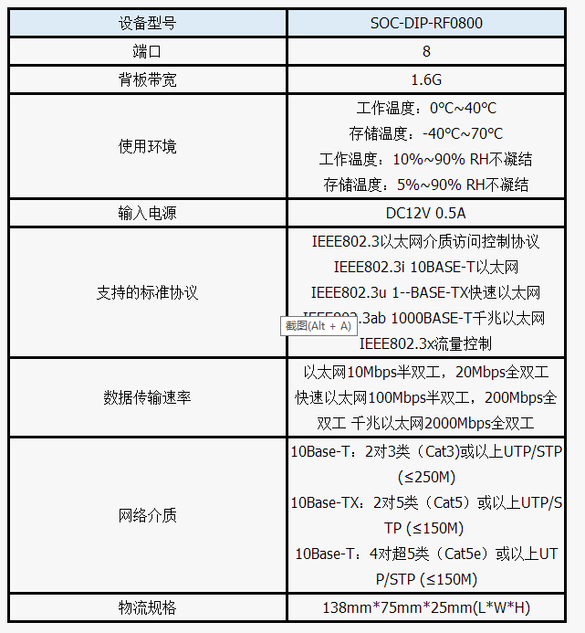 申瓯SOC-DIP以太网交换机系列产品专业为无线AP覆盖、网络监控工程、中心数据交换等应用场景而开发的以太网交换机,使用该系列产品可以方便地应用于无线访问热点(AP)、IPC监控摄像机、局域网络等建设场景。功能特点:◆符合IEEE802.3