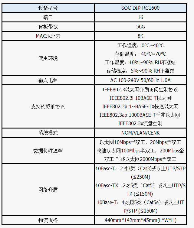 申瓯SOC-DIP以太网交换机系列产品专业为无线AP覆盖、网络监控工程、中心数据交换等应用场景而开发的以太网交换机,使用该系列产品可以方便地应用于无线访问热点(AP)、IPC监控摄像机、局域网络等建设场景。功能特点:◆符合IEEE802.3